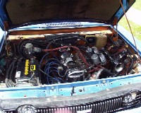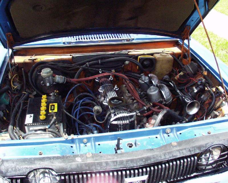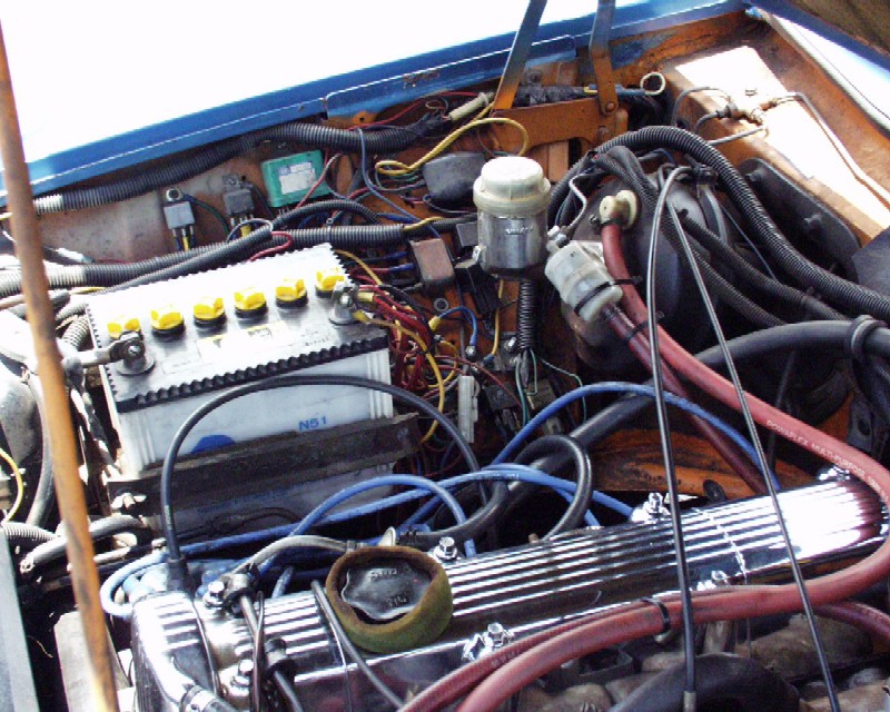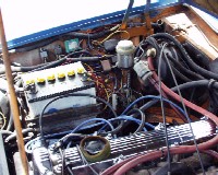 The engine is a Leyland OHC six, with A/C fitted , airhorns, twin SU's (ex Kimberley)and auto. Peter has chrome plated the rocker cover and is having some problem with the filler cap. Every spare spot has a relay.